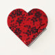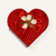 Colour photograph of a red bow and white flowers, and black lace on a red background.