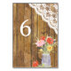 This pretty wedding table number card features an image of a bright floral bouquet in a mason jar vase against a glowing wood panel background. A floral white lace banner hangs against the wood at the right side. Your custom text is in white at the left side. The back of the card is identical to the front. *This design uses floral artwork from www.CreatetheCut.com.