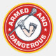 Lacrosse design - Armed and Dangerous sticker. Circular emblem design of muscular arm with glove holding lacrosse stick. Lacrosse sticker. Red and Yellow version. Gifts and gear for lacrosse players and fans.