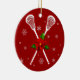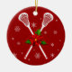 Lacrosse Christmas tree ornament. Lacrosse sticks and holiday poinsettia with snowflakes on red background. Lacrosse holiday decoration.