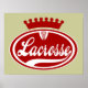 Lacrosse is King. Cool, retro-style signage design. Oval with cursive lettering of the word lacrosse with lacrosse stick symbol within. Adorned with vintage crown. Lacrosse poster. Version: red and white with light champagne gold background.