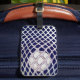 Lacrosse gear bag or luggage tag featuring lax mesh and ball design on navy blue background.