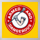 Lacrosse design - Armed and Dangerous poset. Circular emblem lax design of muscular arm with glove holding lacrosse stick. Red and Yellow version. Cool unique lacrosse gift for lacrosse players and fans.