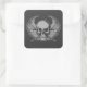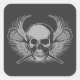 Lacrosse skull. Take off on the iconic skull and cross bones design. Skull and crossed lacrosse sticks with winged background element. Design style: Grey.
