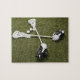 Lacrosse sticks, gloves and balls on artificial jigsaw puzzle