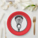 Lacrosse party or team event plates featuring lax stick art on red background.