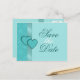 A faux satin turquoise ribbon delineate between a lovely tone on tone turquoise damask pattern and a solid light blue-green on the front of this romantic save the date announcement postcard. Two love hearts in the same damask and trimmed in dark blue-green lace accent the ribbon. All customisable text can easily be changed to suit your own needs.