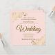 This simple wedding invitation features a pale blush pink coloured background with lacy faux foil gold curls and swirls in the corners. The wording is formal with elegant script gold lettering.