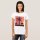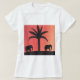 This white T-shirt is designed with my depiction of two elephants and a palm tree silhouetted by an orange sunset sky.