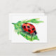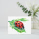 traditional watercolor artwork of a lady bug in red with black dots on a green leaf as a decorative postcard