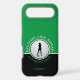 Custom cute design features a black and green color blocked background showcasing a realistic golf ball with a lady golfer silhouette in black. Cute golf quote text reads, "Eat, Sleep, Golf, Repeat! Any Questions" in white & green typography. Customize with name, initials or short line of custom text. Contact beachpausedesigns@gmail.com or message me at the bottom of this listing with questions or custom color requests!