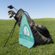 This custom design features a female golfer silhouette set on a realistic golf ball image. The golf ball is placed on a teal circle that is bordered with curved text "GOLF GOLF GOLF GOLF" in white font. A matching teal band holds a template for a monogrammed name or custom text. The background is light teal with a modern abstract pattern of dark teal circles. All colours in this design may be customised! If you have any questions regarding this or any of my designs please contact beachpausedesigns@gmail.com. Custom requests accepted.