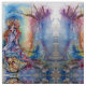 Elegant, whimsical and artistic design in vibrant pink,blue,red,purple colours Watercolor painting 1989.----Vivien , this mysterious female gave Arthur his sword, Excalibur. She stole Lancelot when he was a child and cured him when he went mad. She may be a Celtic lake divinity in origin, perhaps of the same kind as the Gwagged Annwn - lake fairies in modern Welsh folklore. Vivien may very well have been the Lady of the Lake in the Arthurian Legends and stories. She, sometimes called Nineve, Nimue, Niniane, etc., is best known as the woman who sealed Merlin in a cave or a tree.