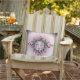 This decorative pillow in outdoor fabric has a lady sun with a grey face with pink lips and circle cheeks with scrolled black and pink rays on a pink and dark grey background on the front and back.