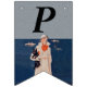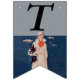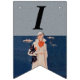 This flag shaped bunting banner has a lady in a white suit standing by the ocean with boats in the background holding a black Scottish Terrier Dog. Customise the Happy 40th Birthday text with the templates.