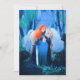 The digital illustration depicts a beautiful young lady with a with red curly hair. She wears a long dark cape and the seals of a knight, and she holds a shining sword in her hand. With the other hand she hugs a calm white horse with a magical beautiful mane. They are surrounded by a mysterious evening forest