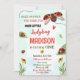This cute invitation for girls first birthday party featuring polka dot ladybugs, flowers and some greenery around.