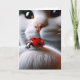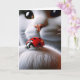 A close-up of a cat's face shows its curious gaze on a vibrant red ladybug perched on its fluffy white paw.