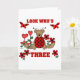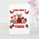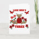 A teddy bear ladybug, red heart flowers, and text text that reads "Look Who's Three" on a cute 3rd birthday design.