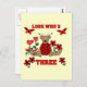 A teddy bear ladybug, red heart flowers, and text text that reads "Look Who's Three" on a cute 3rd birthday design.