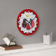Cute, whimsical art featuring mum, dad and baby ladybug out for a stroll in the garden. Mrs. Ladybug has a daisy flower umbrella. Wavy edge red border. Larger red dots show positions of 12, 3, 6 and 9. Smaller red dots indicate the other hours in a day.