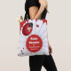 All-over print tote bag showing several ladybugs on a flower. The overall colours are red, white, and black. This item has the text for a baby shower party.