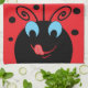 This adorable lady bug with cute swirly antenna, big blue eyes and black polka dots on her red wings is licking her smiling lips in eager anticipation of the day.