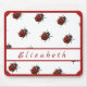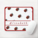 Ladybug With Name Mouse Pad design features a cute ladybug pattern against a white background. Name/text is displayed across the front in a red/burgundy colour. Design is bordered with a red/burgundy border.
