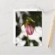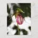A close up photograph of a pink Lady's Slipper that has grown in the shade of a tree.