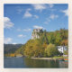Glass photo coaster with Bled castle on a high cliff above Lake Bled, surrounded by trees with foliage in autumn colours in a beautiful fall landscape in Bled, Slovenia.