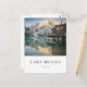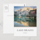 Photo postcard of the boat house in the water of Lake Braies / Pragser Wildsee lake with reflection of the Dolomites mountains in the still water in South Tyrol, Italy with a white box with the text 'Lake Braies, Italy' and lines in green, white and red, the colours of the italian flag.