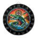 Detailed circular design of a crocodile in a lake with a bold, centred target.