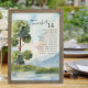 Lake Evergreen Watercolor wedding table seating chart with the number and guest list on an idyllic scenic landscape.. The table number and guest seating list is editable and displayed on both sides. Watercolor country scenery with evergreen trees and greenery, blue mountains and a still lake under a clear blue sky. The design is in shades of dusty blue, periwinkle and green and is lettered with elegant script and modern typography. Please browse my Lake Evergreen collection for matching items or message me to create the templates you need.
