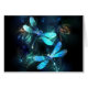Two transparent, luminous, turquoise, artistically drawn dragonflies on night background with luminescent lake algae and fireflies. Glowing dragonfly.