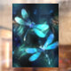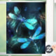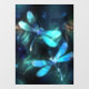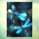 Two transparent, luminous, turquoise, artistically drawn dragonflies on night background with luminescent lake algae and fireflies. Glowing dragonfly.