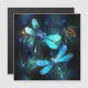 Two transparent, luminous, turquoise, artistically drawn dragonflies on night background with luminescent lake algae and fireflies. Glowing dragonfly.
