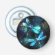 Two transparent, luminous, turquoise, artistically drawn dragonflies on night background with luminescent lake algae and fireflies. Glowing dragonfly.