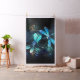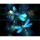 Two transparent, luminous, turquoise, artistically drawn dragonflies on night background with luminescent lake algae and fireflies. Glowing dragonfly.