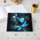 Two transparent, luminous, turquoise, artistically drawn dragonflies on night background with luminescent lake algae and fireflies. Glowing dragonfly.