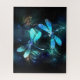 Two transparent, luminous, turquoise, artistically drawn dragonflies on night background with luminescent lake algae and fireflies. Glowing dragonfly.