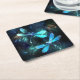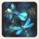 Two transparent, luminous, turquoise, artistically drawn dragonflies on night background with luminescent lake algae and fireflies. Glowing dragonfly.