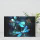 Two transparent, luminous, turquoise, artistically drawn dragonflies on night background with luminescent lake algae and fireflies. Glowing dragonfly.