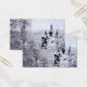 A photograph showing just a glimpse of the mountain lake through snow-covered fir trees. This landscape picture is digitally manipulated to look like a watercolor.