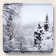 A photograph showing just a glimpse of the mountain lake through snow-covered fir trees. This landscape picture is digitally manipulated to look like a watercolor.