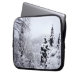 A photograph showing just a glimpse of the mountain lake through snow-covered fir trees. This landscape picture is digitally manipulated to look like a watercolor.