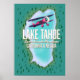 Lake Tahoe USA map travel poster (Lake Tahoe is a large freshwater lake in the Sierra Nevada Mountains, straddling the border of California and Nevada). Featured in a beautiful vintage style.