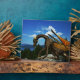 A dragon sits on a large boulder looking over a forest of pine trees towards a lake.