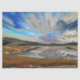 An art design of a lake with the dramatic sky reflected in the lake water. Hills and fields surround the lake.
