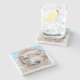 The coasters are gorgeous, a quality feel and heavy weight. They look like a precious archeological find. A rustic stone juxtaposed with a modern floral black and white print. I like the way the print goes slightly imperfect on the cut stone edges giving them a kind-of natural beauty.