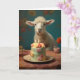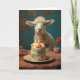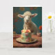 Step into a birthday celebration that's as cozy as a woolen blanket with this charming card that's all about farmyard sweetness! Here's a cute lamb, its eyes wide with wonder, seated at a table like it's ready for a tea party. And what's the guest of honor? A birthday cake, adorned with floral patterns made of icing, looking as scrumptious as fresh spring grass. The setting is an old farmhouse, complete with blue floral wallpaper that adds a touch of rustic charm. This isn't just a birthday card; it's a pastoral party in paper form. Inside, there's a blank space, perfect for your own farm-fresh felicitations or lamb-tastic love notes.